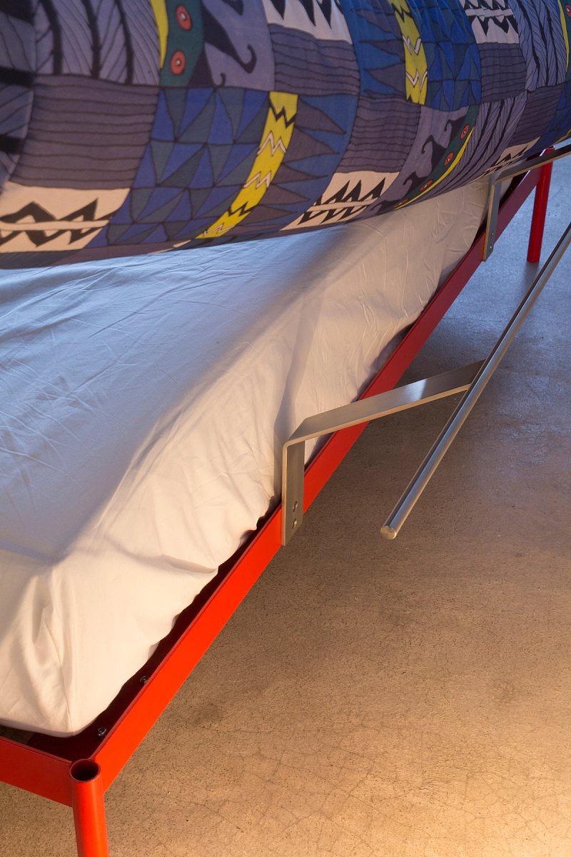 The Bed is part of our Daily Camping object series and fabricated in Porto. The symmetry introduced by two headboards makes the it versatile and social. Instead of lying next to each other, you can lie in opposite directions, looking at each other. The bed no longer has a front nor back side, it can float in the room and become a sofa-island or day-bed. The frame can be flat packed and the two headboards can be mounted where needed.