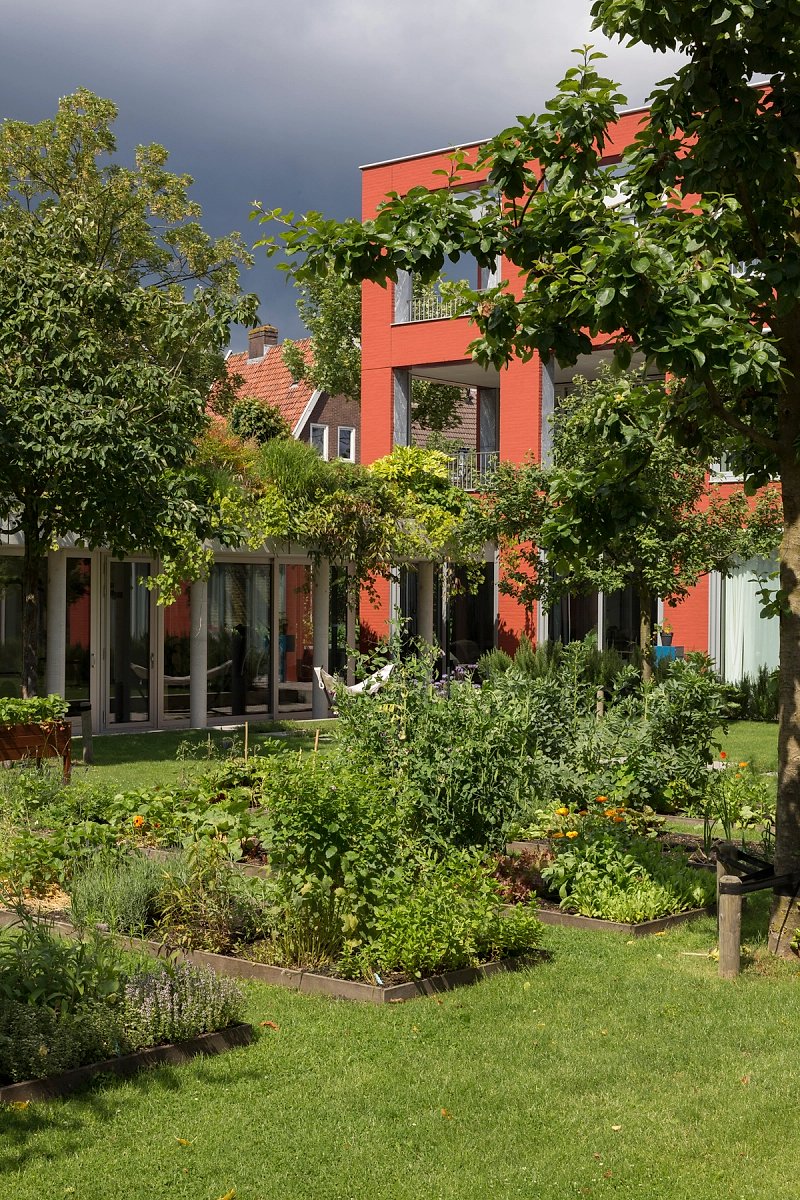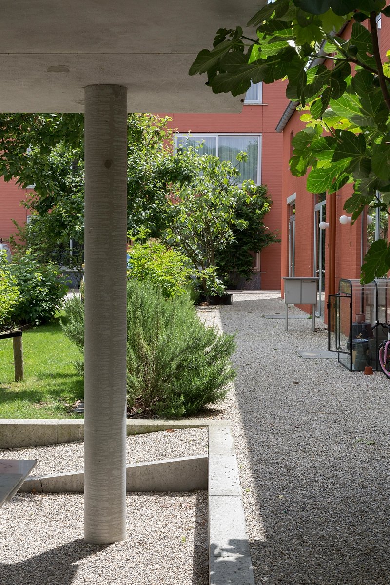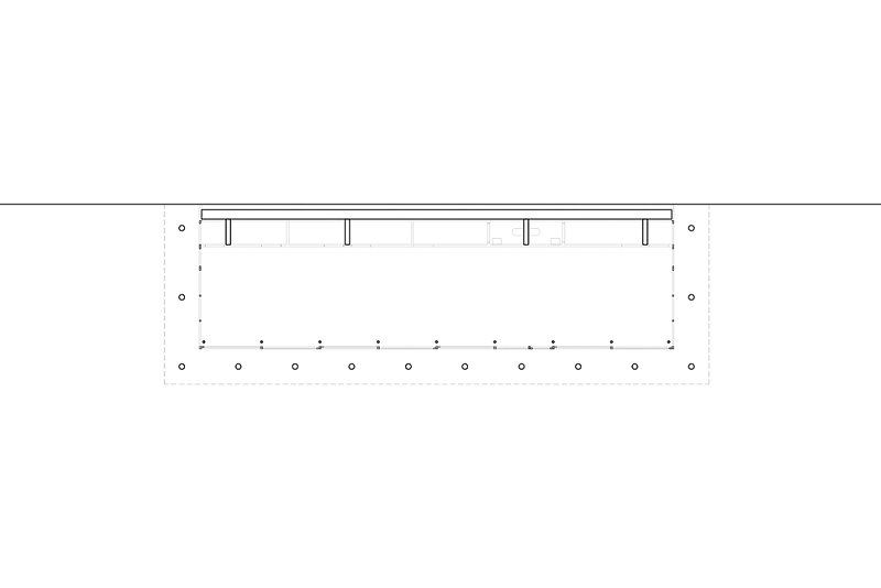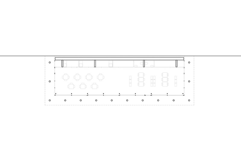 Developed as a project without specific program, the building defines one big room that opens up towards a shared courtyard with allotment gardens. Along the rear side, the room is lined with a service strip that provides space for water, toilets and storage for flexible uses to take place. While the inside is constructed in wood and steel, a large concrete planter for lush plants, supported by a colonnade, frames the room and provides a canopy that extends into the garden.