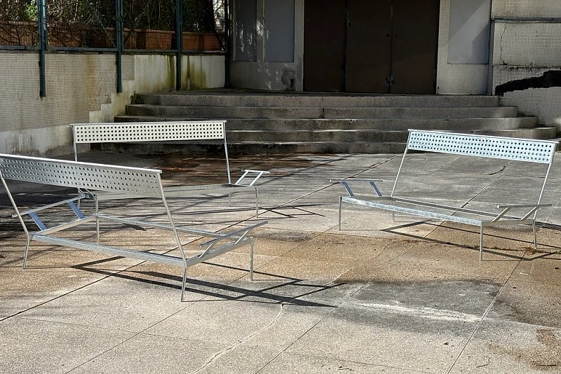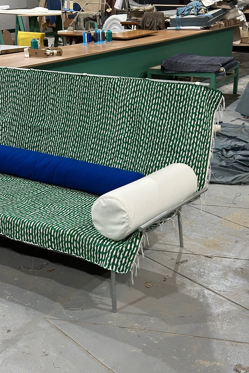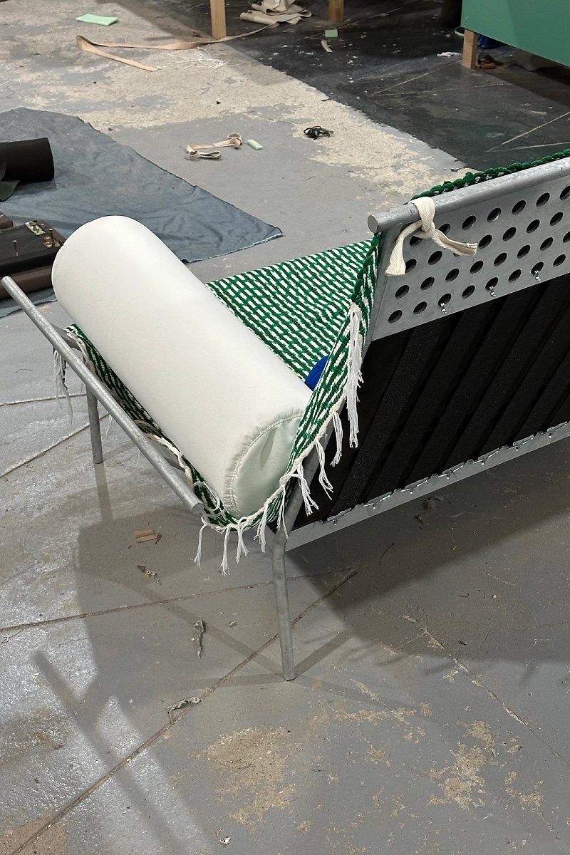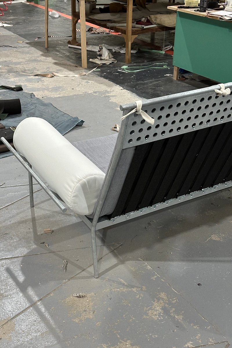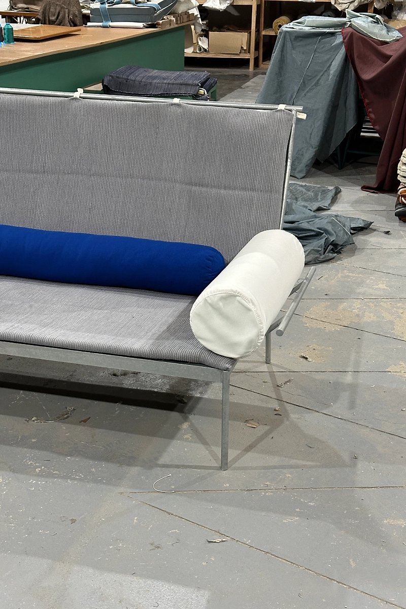 The Sofa is part of our Daily Camping object series and fabricated in Porto. A robust and light-weight galvanised steel structure forms the base frame that supports a range of different cushions. Elastic woven webbing provides comfortable surfaces and minimises the use of foam and cushioning needed.