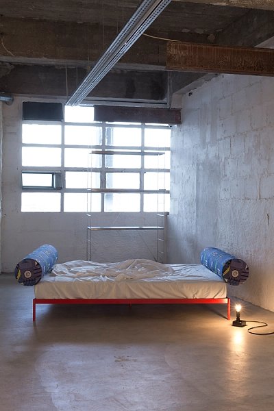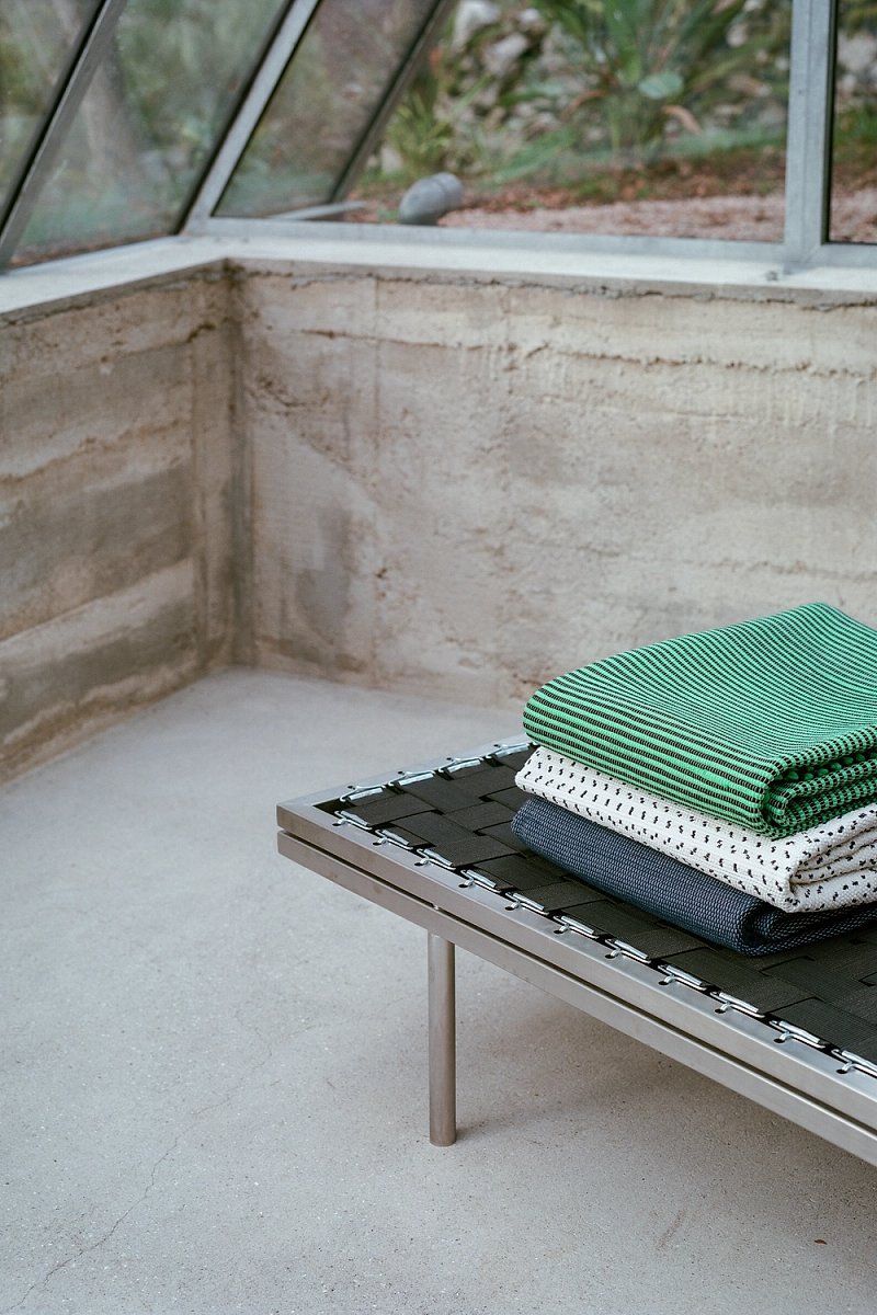 The Double daybed is part of our Daily Camping object series and fabricated in Porto. The daybeds are light-weight, stackable and do not need a mattress. Elastic webbing is stretched between stainless steel frames to provide a soft surface that is topped with colourful carpets that are produced in the North of Portugal and made of the leftover material of cotton factories. Two daybeds can be used side-by-side or stacked into each other as a single daybed to safe space.
