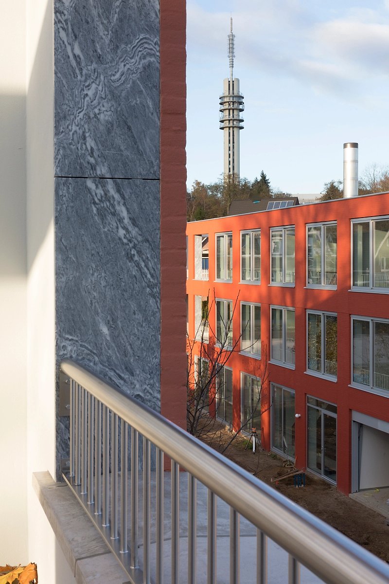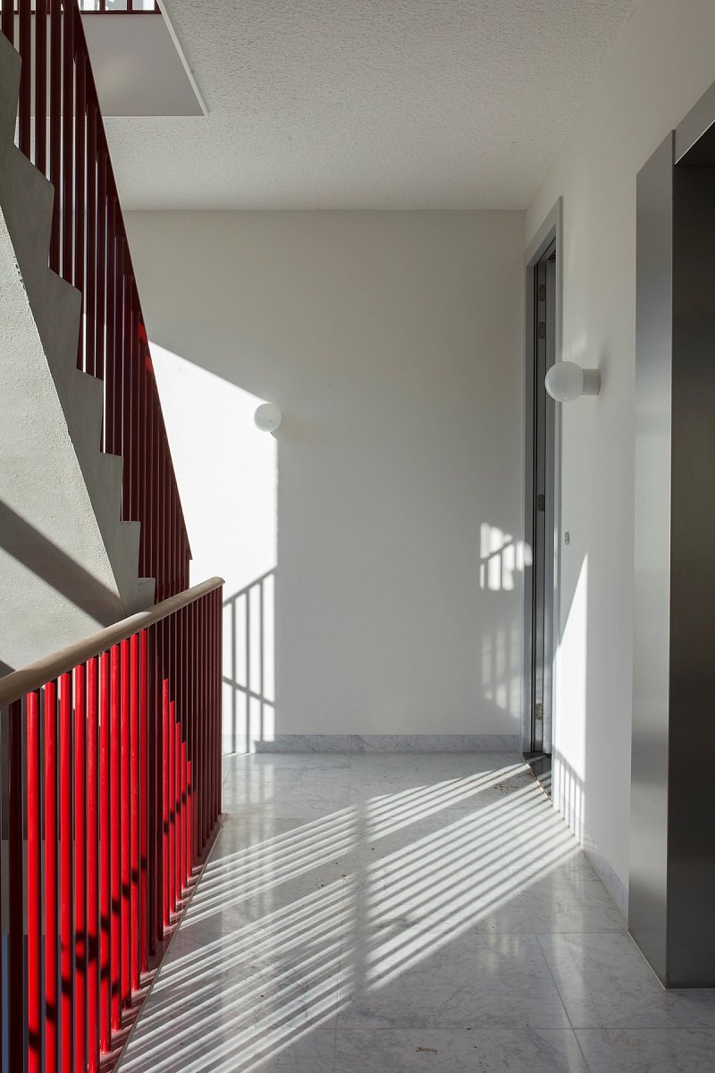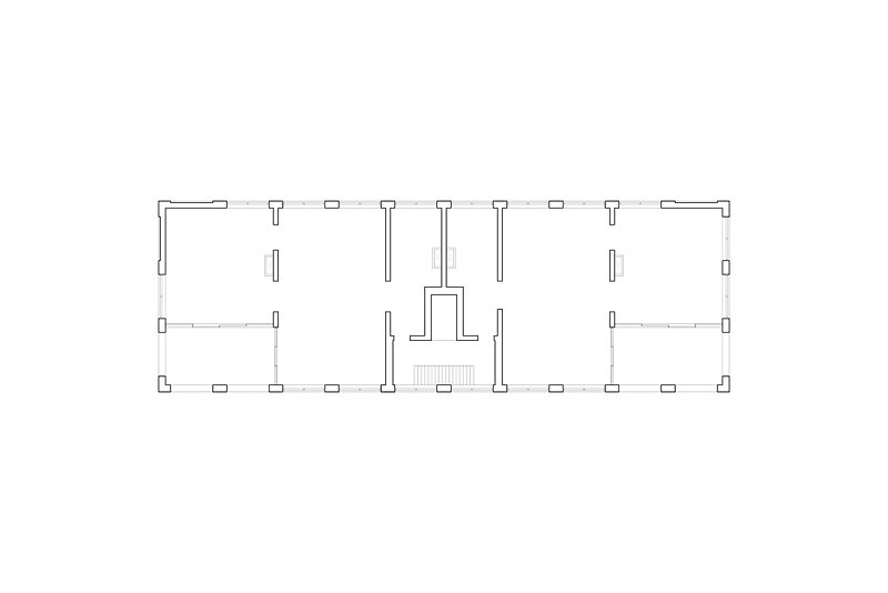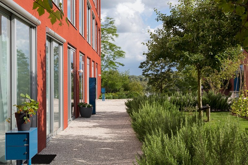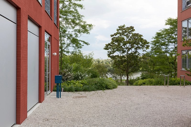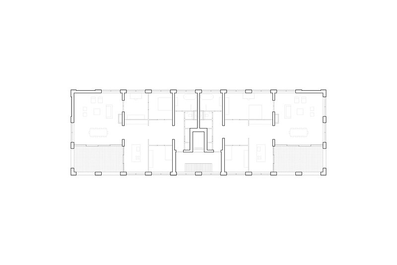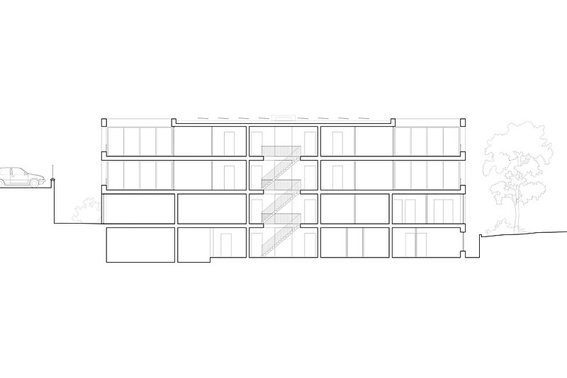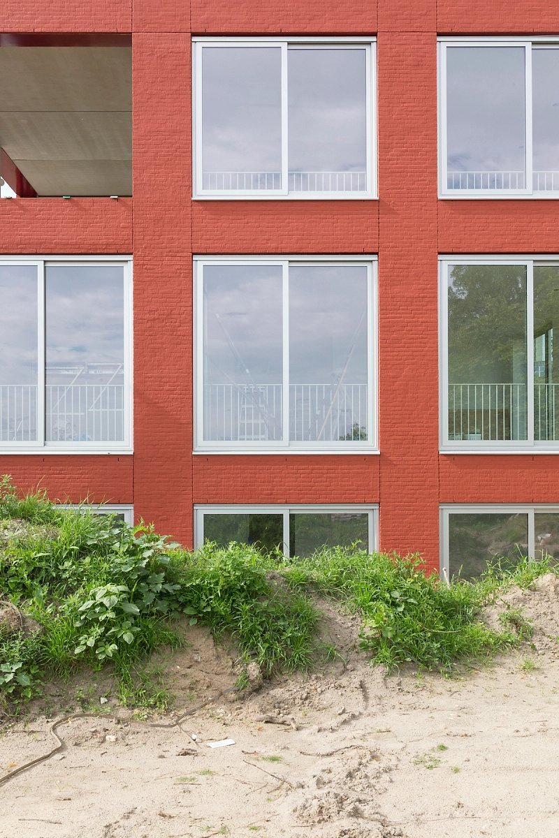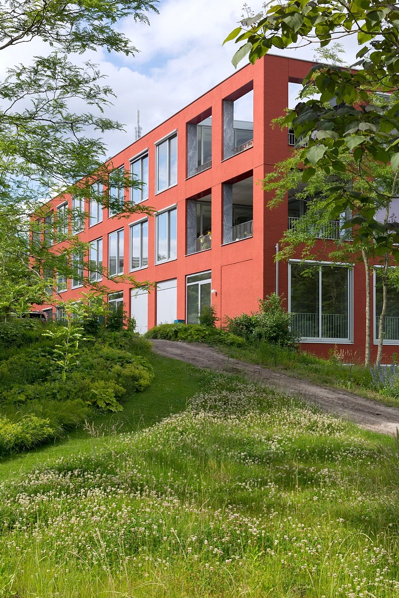 The four-story apartment building with its long and slender proportion marks the eastern end of this residential development and forms a courtyard together with three other buildings. While the brick facade is characterised by a repetitive grid of windows, on the inside, in contrary, you find an enfilade of differentiated rooms. Doors are placed along the central spine of each apartment and give views across the length of the building and out into the landscape.