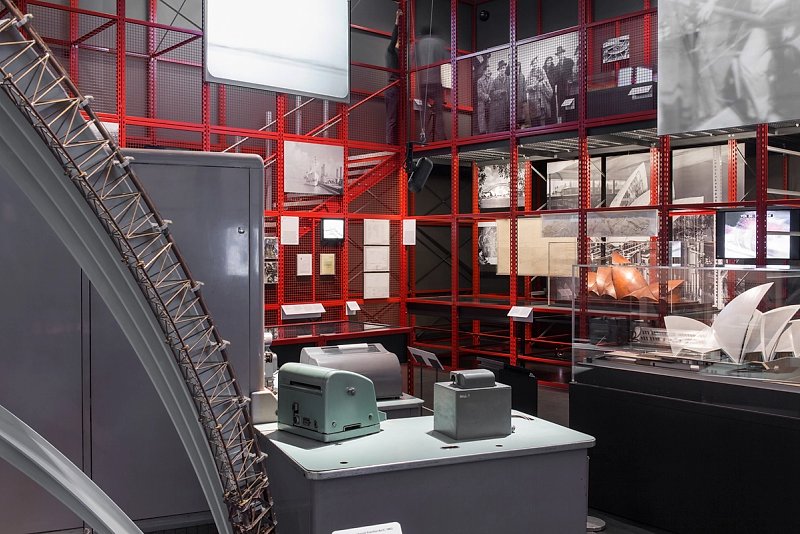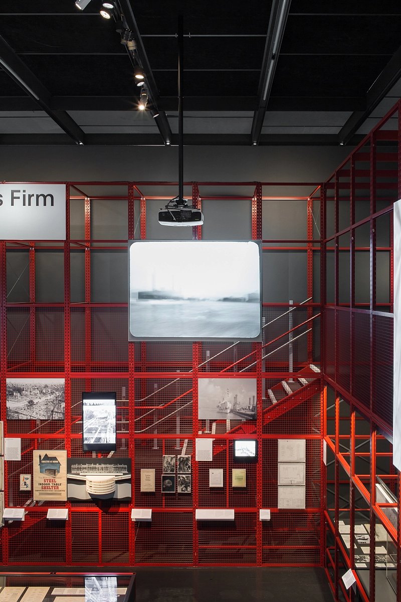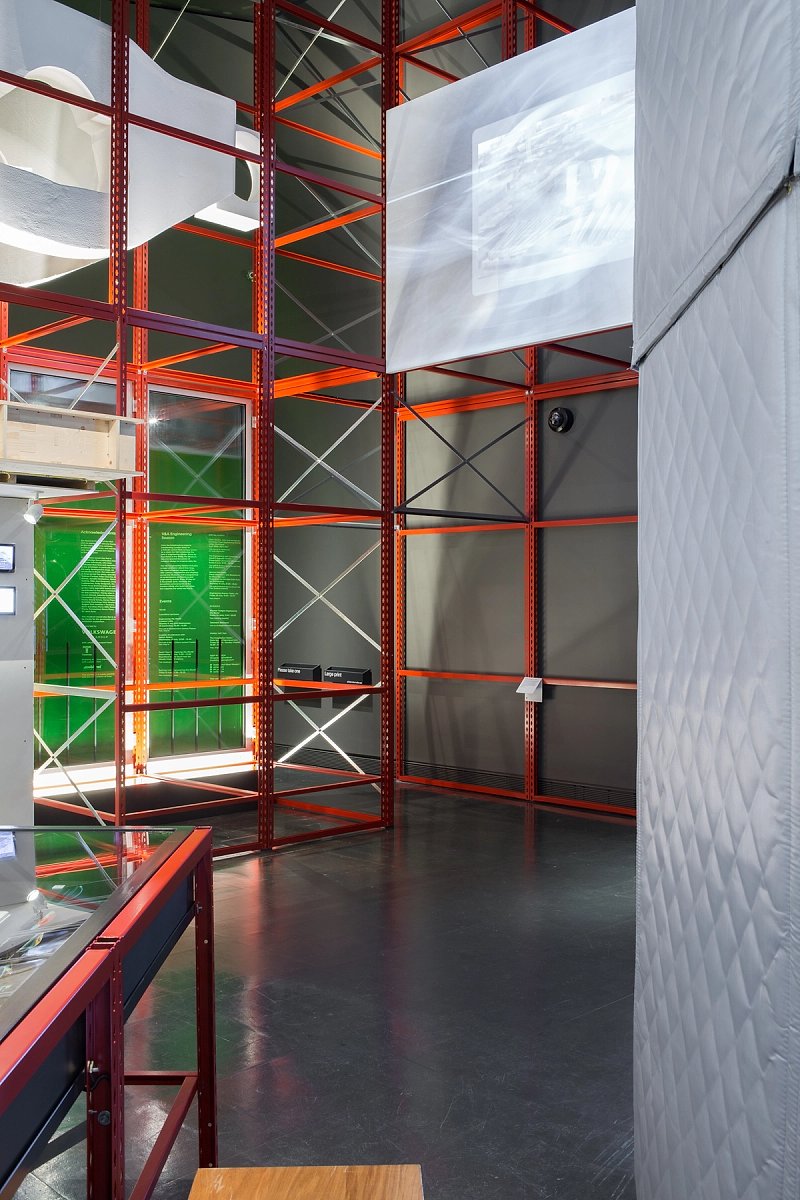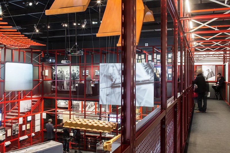The design of this first major retrospective on the life and work of Ove Arup, the most influential engineer of the 20th Century, is based on a two storey tall red industrial shelf that wraps the entire perimeter of the exhibition space. The intervention creates a multi-layered and dynamic space that is capable to bring together and expose several hundred exhibits of various sizes and types.