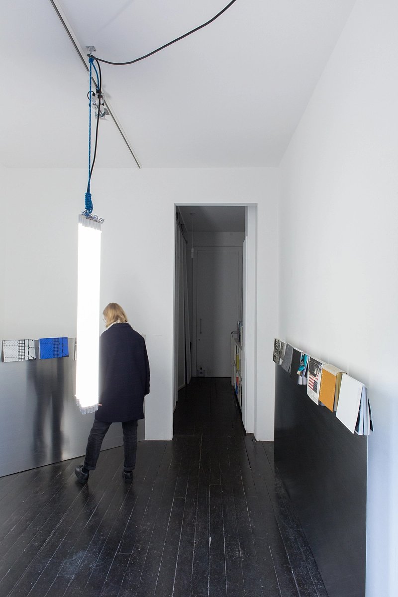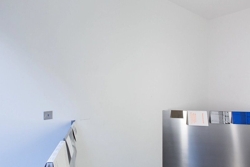 A minimal installation of three stainless steel sheets form an edge to exhibit ‘The Most Beautiful Swiss Books’ in a London gallery. This annual exhibition was established to promote and reward the finest book design in Switzerland, at the behest of the famous typographer and designer Jan Tschochold in 1943.