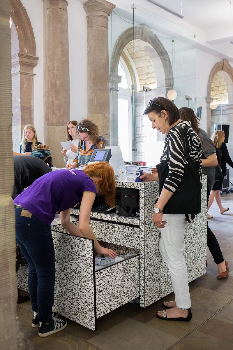 The project introduces a family of flexible furniture pieces that transform the foyer of the Fridericianum into an open and dynamic space. During normal opening hours this space functions as spacious entrance with ticket desk, bookshop and cafe with seating. During evenings it can transform to host talks, screenings and a bar during exhibition openings. The interventions are simple and playful and aim to maintain the original feeling of the space as one big 'empty' room.