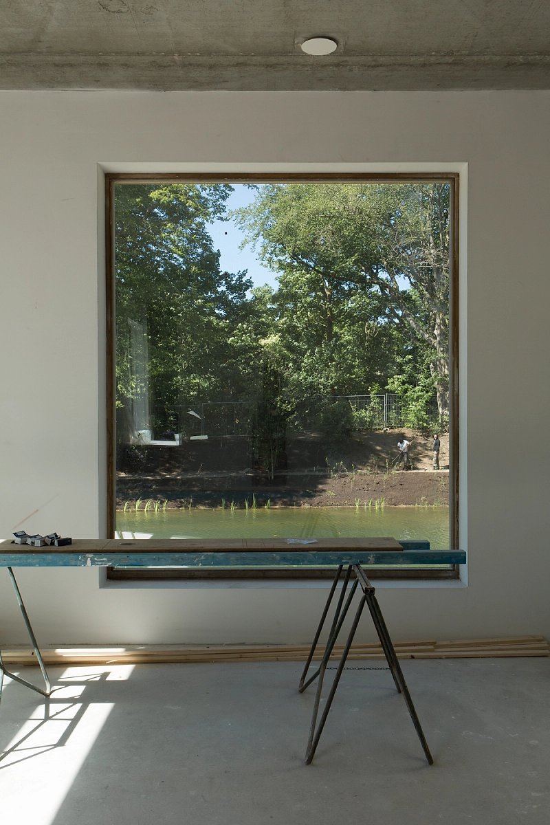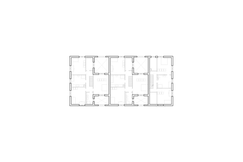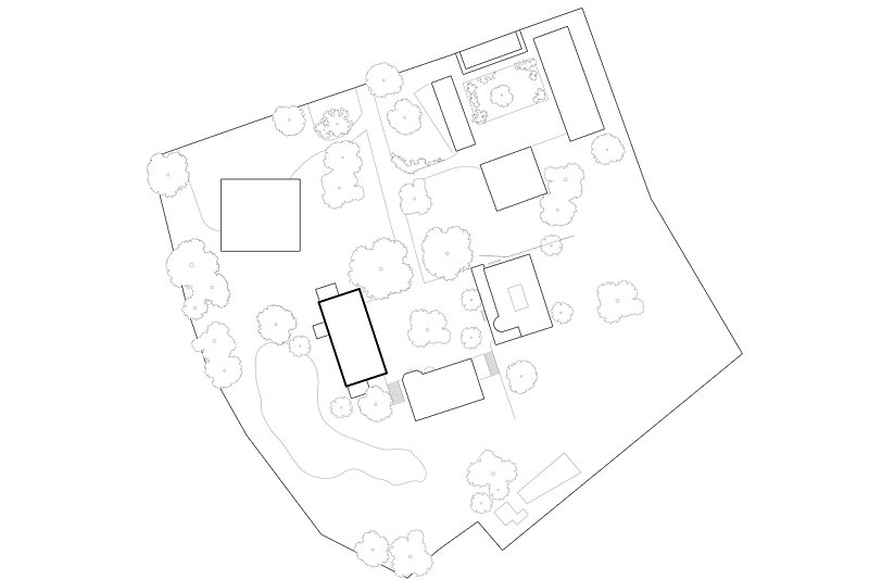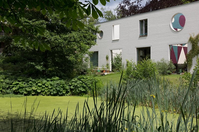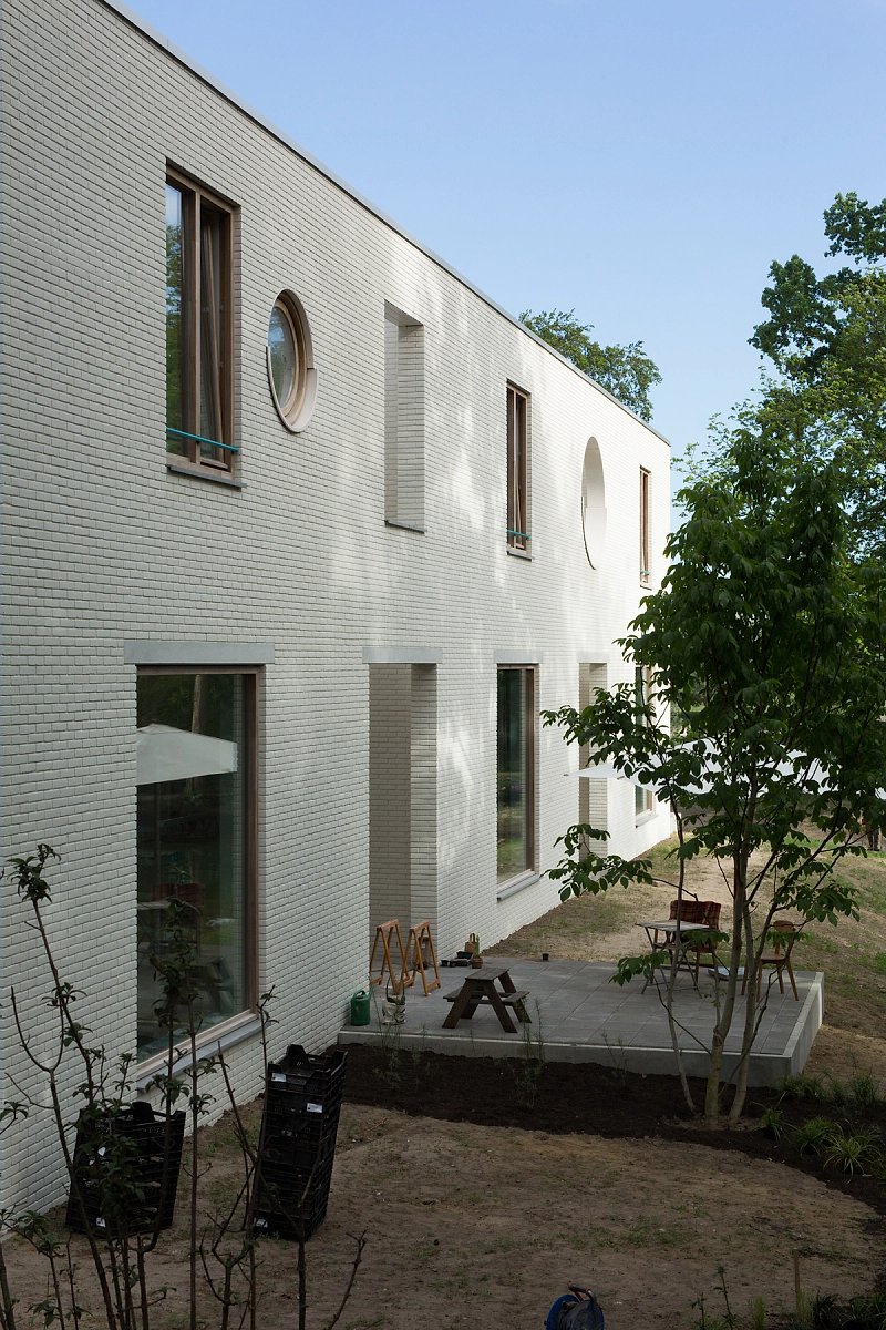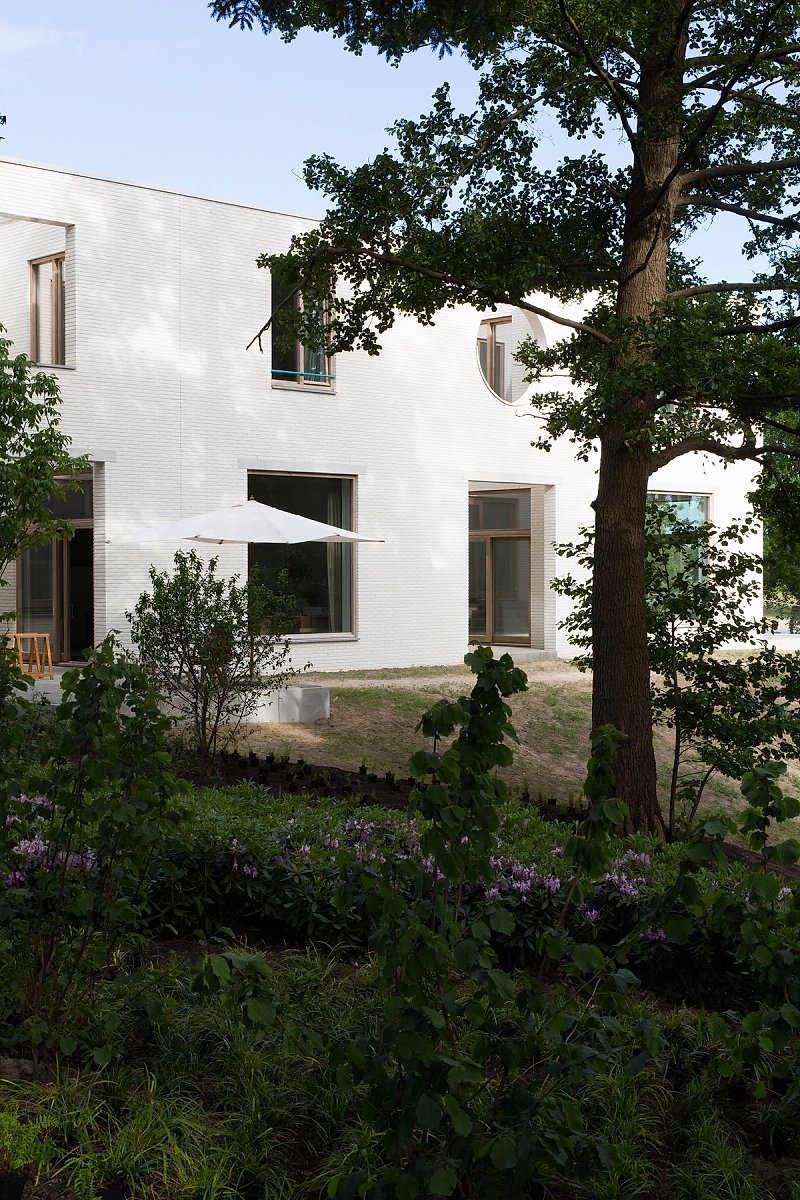 One big house for three families. A seamless white brick facade wraps a sequence of large and small rooms into one simple building form. This field of rooms is interrupted by four patios that mediate the transition to the shared landscape. Only the windows hint at the different spaces hidden behind the envelope. Towards the square, that the building forms with an existing villa, the patios form the entrances. Towards the other side, facing a pond, the patios become balconies that step into the garden.