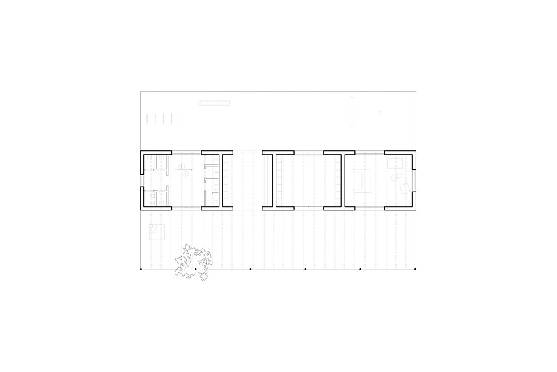 This narrow and long building facilitates the arrival of sailers and visitors and provides practical and social spaces for a vivid harbour life. A large platform is divided into two zones by a row of four equal rooms that run along the middle. Each room opens up to both sides with large openings to form a welcoming and flexible structure. Towards the parking space the open platform provides space to mange the arrival and unload material. Towards the water side the glass roof of the building extends and covers the remaining platform to create a generous covered outdoor space for various activities to take place. A continuous grid of solar cells are embedded into the 280 m² glass roof to supply the harbour with electricity and create shade during the summer time.