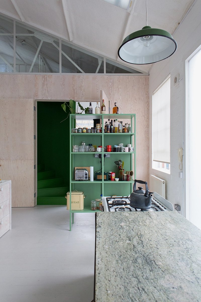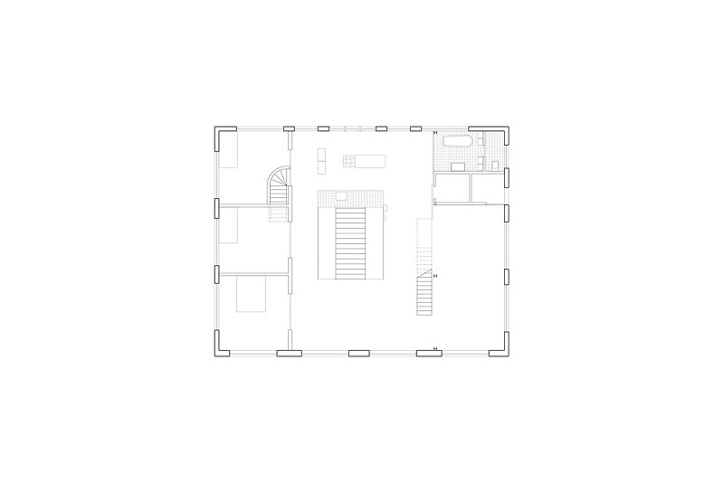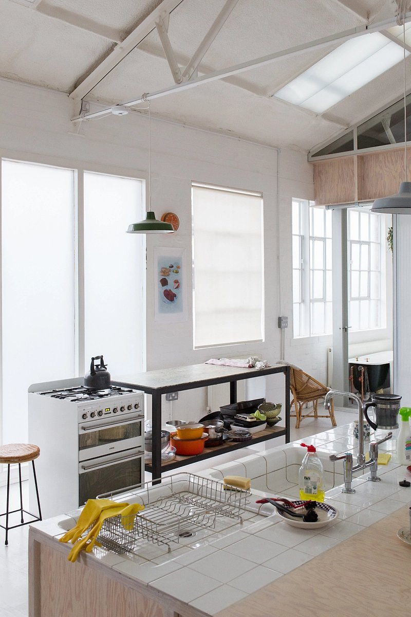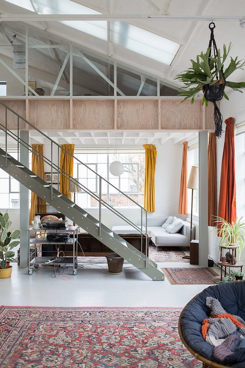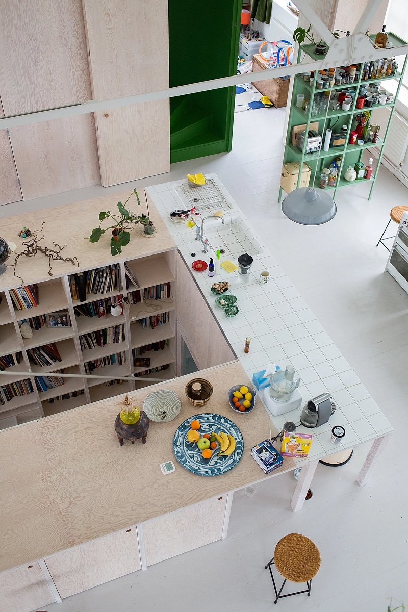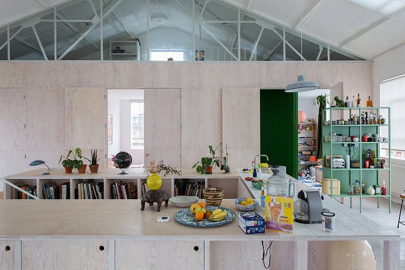 This project converts a former warehouse into a social and fluid interior landscape for an artist and his family to live in. It explores an economic intervention with minimum impact on the existing building fabric that keeps the spirit of the original open space alive. Two new timber platforms introduce a variety of rooms that overlook the central double-height space with the entrance staircase and kitchen at its heart.