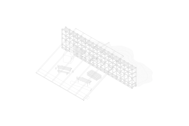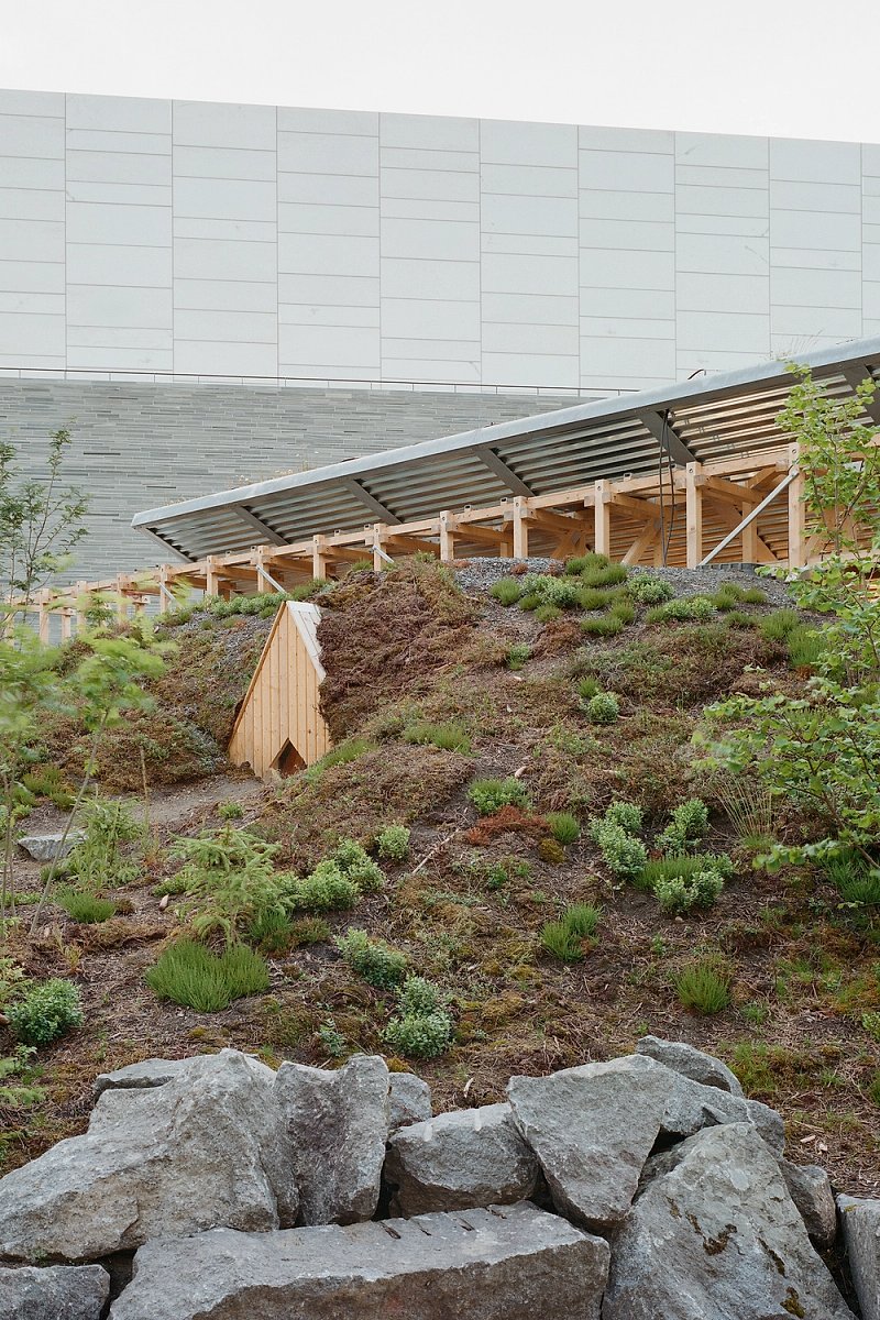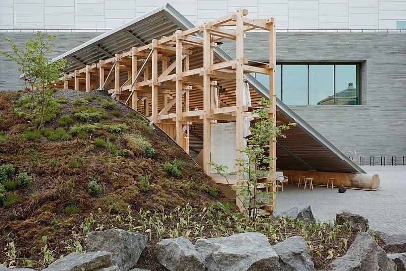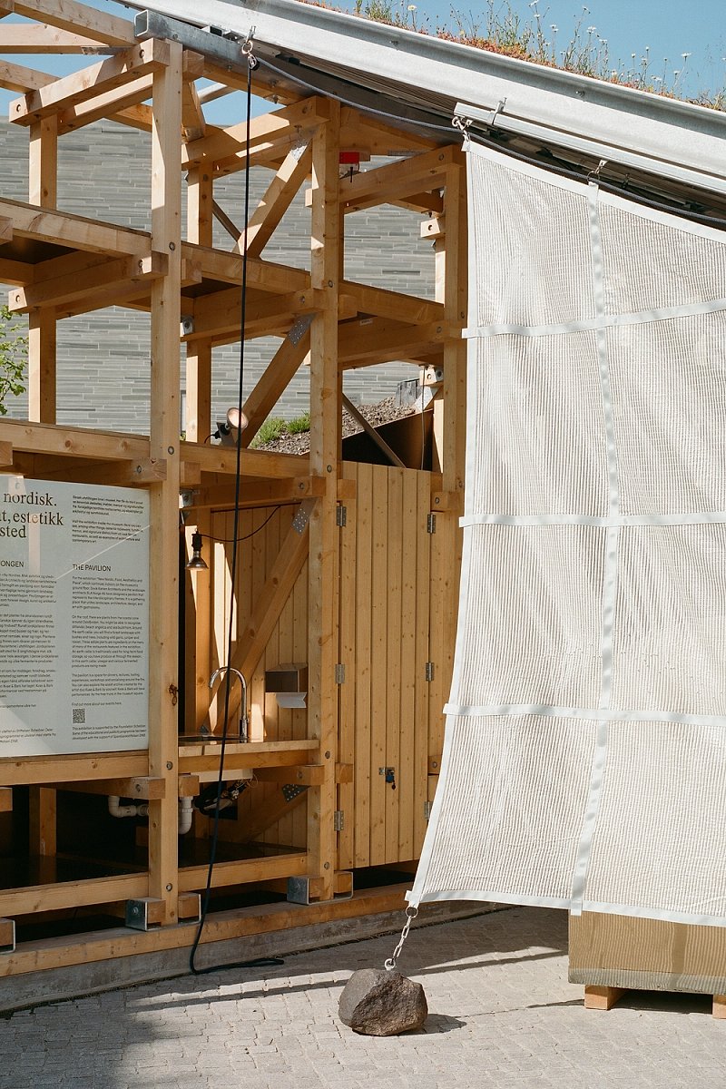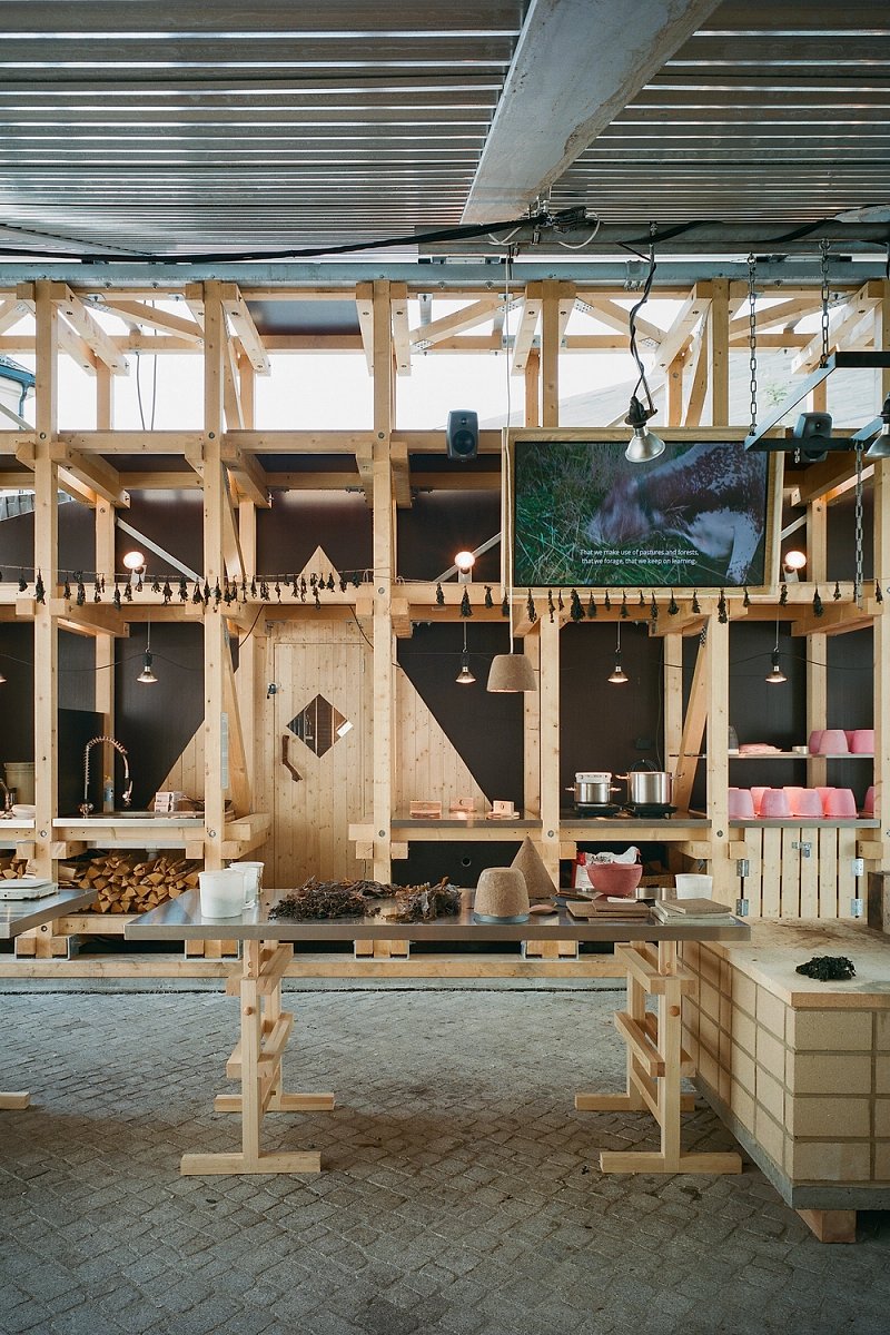 Inside the exhibition the shelf becomes an archive, a neutral frame, where materials, objects, tools and works of art are displayed as equal. The pavilion hosts a range of programmes, including workshops, test kitchens, performances and displays. Much like a New Nordic dish, the pavilion is a composition of three recognisable Nordic elements: a coastal landscape on the roof, a wooden structure and a forest terrain with an earth cellar.